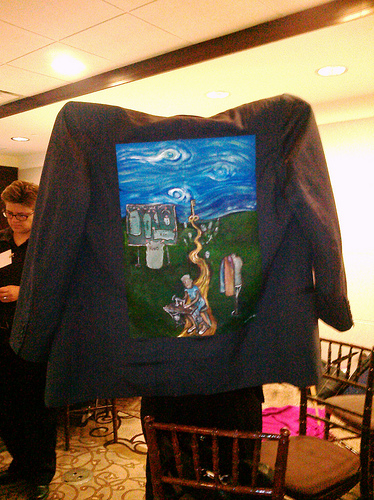 He said, “Fine, I will tell you my story.” About two weeks later we found ourselves at the same event in Philadelphia July 13-14, 2011 at the Regional ONC Meeting. I would paint four jackets in two days and Paulo’s would be the fourth. He took it off his back and it was a very special jacket.