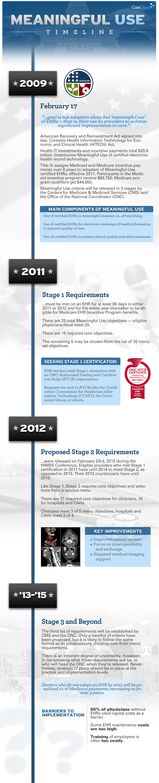 Let’s face it, understanding Meaningful Use can be a challenge. There are a number of key requirements that must be meet to achieve each stage of Meaningful Use not including the understanding the differences in EHR certification bodies such as CCHIT and Drummond Group. Care Cloud recently created this educational infographic that provides a concise timeline of Meaningful Use outlining the main components, stage requirements, key benefits, and barriers to implementation.