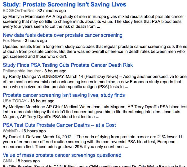 A study in the NEJM reports that after 11 years of follow up in a very large cohort of men randomized either to PSA screening every 4 years (~73,000 subjects) or to no screening (~89,000 subjects) there was both a reduction in death and no mortality advantage. How confusing can things get? Here is a screenshot of today’s headlines about it from Google News: