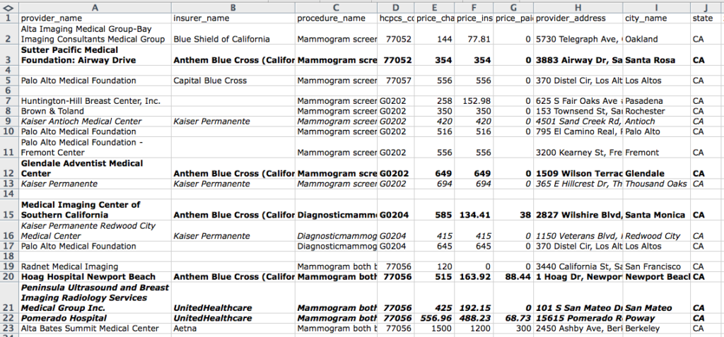 What’s even more interesting, according to our contributors: The same insurer, United Healthcare, can pay $192.15 at Peninsula Ultrasound and Breast Imaging Radiology Services Medical Group Inc. in San Mateo, and $488.23 at Pomerado Hospital in Poway for the same procedure, number 77056, a diagnostic mammogram. (We highlighted United by boldface and italic in the spreadsheet.)